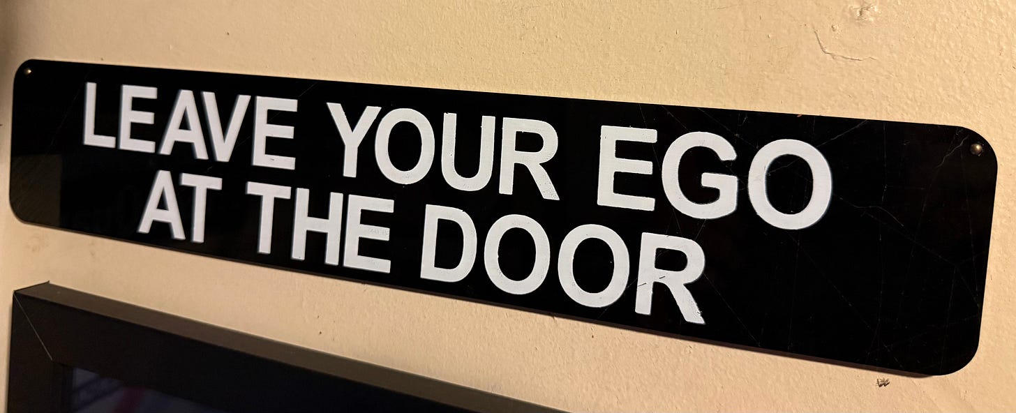 I used to think being a great manager meant having the sharpest answer, the quickest decision, and a rousing Braveheart speech at the ready. (My inner Frenchman applauded; my inner Scot checked the budget.) It worked—up to a point. I even had a sign to remind myself to not be the biggest ego in the room. “Leave your ego at the door” it says. Like why did I need a reminder in the first place. Live, leave and learn.